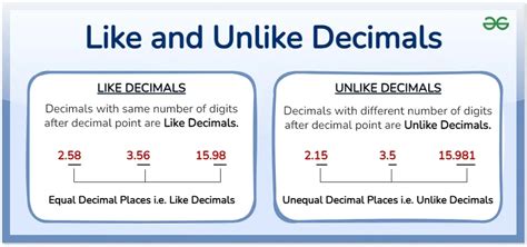 Like and unlike decimals are two different types of decimals. Like decimals are decimals that have the same number of decimal places. For example, 0.25, 0.250, and 0.2500 are like decimals. Unlike decimals, on the other hand, have different numbers of decimal places. For example, 0.25 and 0.250 are unlike decimals.